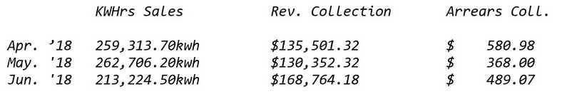 Total customers served during the 3rd. Quarter, FY2018 were 1891 with approximately 83% on Cash Power meters. Customers sector with CP meters were 1262 residential, 178 commercials, 51 state gov’t and 59 non-state gov’t accounts.